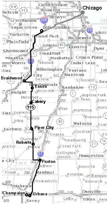 Four miles south of Essex, turn right onto IL 17, then turn south again after 1.5 miles (the second left) on Cabery Road (Co 18 or 1800W). After 4 miles there is a junction with IL 115 (4000 S), where you will continue straight, onto IL 115. This is the route that you will follow for the next 42 miles. You will pass through Cabery and make a couple turns as you pass through Piper City. You may want to stop in Roberts at the Sundae Drive to see what the ice cream of the day is. One year some club members who had stopped there en route to the CBCF were invited to see a large collection of exotic cars that is stored there. IL 115 ends at IL 9, which you can take east (left) to Paxton, and then turn south (right) to take US 45 to Urbana-Champaign. Alternatively, since the road actually continues south where 115 meets 9, you can proceed south there, but within a short distance, the surface becomes gravel. We have tried a few of the tertiary roads that lead south from IL 9, but have not yet found an alternative to US 45 that matches the character of 115. We mean to look for such a route each year as we drive to the CBCF, but typically it is getting late in the afternoon by the time we reach Paxton, and we are anxious to get to the Alumni Tap and the company of other British car enthusiasts.