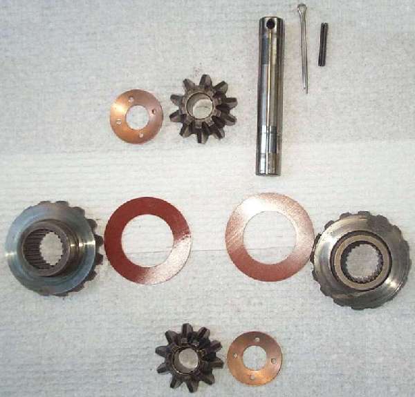 The photo shows the inner pieces of the differential assembly. The pinion pin, the split pin and the tension pin are at the top. The factory did not fit the split pin. You should do it yourself.