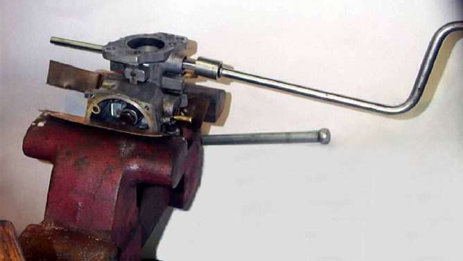Step two. Disassemble one of the carburetters-do one at a time so there is a reference when something does not make sense. Clean the carburetter body with solvent and a pick. Holding the carburetter body securely in a cushioned vise, and, turning the reamer “backwards”, pass the shaft through the body into the hole on the other side. Ream the near side. Check fit a bushing, then remove it, smear with thread-locker and refit. Then ream the remaining throttle rod hole and fit a bush in the same manner.