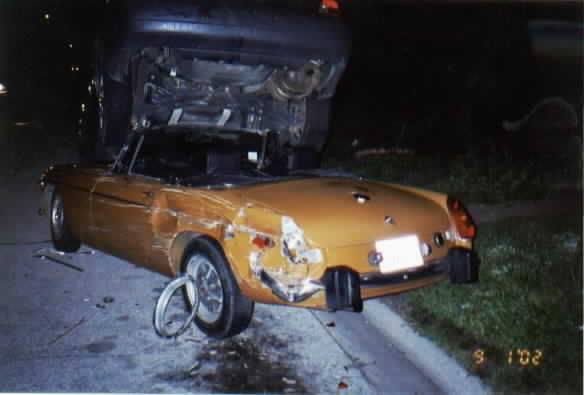 Now the sad part. It was parked outside in front of our Midget. A drunk driver took the corner too fast, clipped the left front of our Midget pushing it out of the way, so our freshly restored B could be rear ended & shoved under the Saturn parked in front of it.