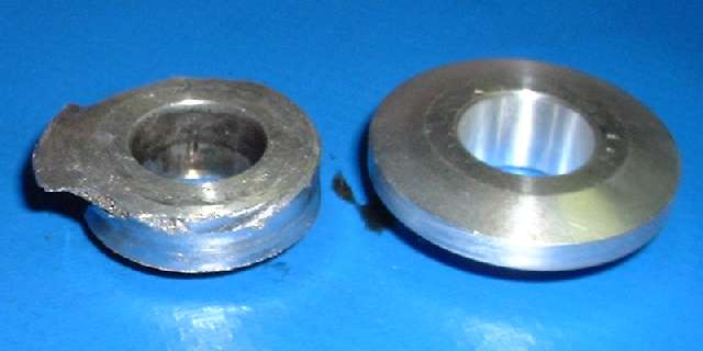 This is the second reported case of this failure in our club this summer. Barney Gaylord had two of these alloy parts break in one day while driving his MGA in the Flying Low Rally on July 6. In that case also there was no other damage to the engine, as the parts apparently failed during normal cruising speed, and the valve float was noticed immediately the first time the engine was run to 5000 rpm. Close inspection of these alloy spring caps reveals that the parts that broke were machined with a thinner edge than most of the other parts, and it was this thin edge that led to the failure of the part. Barney’s engine had at least three of the eight parts with this thin edge condition, and two of those failed after 22,000 miles of running. Dave’s engine had only one of the eight parts with the thin edge, and that one broke with 15,000 miles of running.