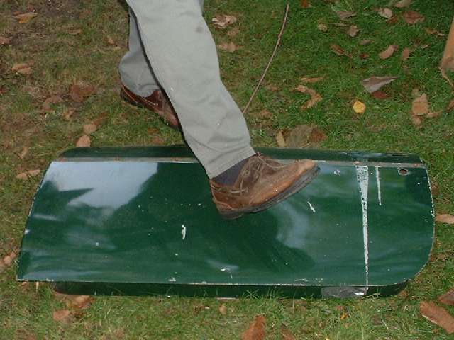 It started with a big bang, or at least a big kick, to produce a good size dent to play with. Then a lot was done in a short time as we demonstrated use of the club’s new stud welder to pull dents, repaired a crack of doom, cut the skin off of a door and crimped a new door skin in place. And we finally tried out the new acetylene.air torch.