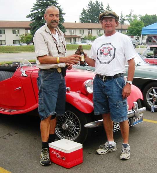 We left Wednesday afternoon, to be in Grand Rapids at dinnertime so we could be at the drivers meeting the next morning at 7 AM. Curt drove the TD, and I was with Henneke, towing our 1932 M-Type for the other events of the University Motors Summer Party 2005. You have read all about that in Co-chairman John Schroeder's Left Hand Drive. Thursday morning, drivers' meeting, odometer check and then we received the list of checkpoints. Most of these were racetracks; a bunch along the western coast of the lower half of Michigan and a bunch in northwest Wisconsin, between Green Bay and Road America in Elkhart Lake. There were 8 teams in the rally, our '51 TD, and MGA with a V8 motor from St. Louis, and 6 B's and B-GT's. Can you believe that the team that turned out to become the winner the next day came in all the way from Kansas City, swapped engines the night before they left, and then was fit enough to go around Lake Michigan? A truly remarkable endeavor. Anyway, I just said "around the lake", as the organizers again made very clear; NO ferries. Which to us is actually not a problem at all. We came to participate in a 1,000 miles plus rally "around the lake" and would really be very disappointed if we were not to go "around", not being able to drive the favorite stretch through the UP in the middle of the night. Therefore the idea of 'teasing' us by making three or four (old) ferry landings also a checkpoint did not bother us a bit. The rally by itself is a great adventure, in any MG, period. And everybody who even thinks he can do it is a winner. Everybody who finishes is an even bigger winner, and every team that finishes with a smile on their face, tired, a little bit dirty, but still good friends are even bigger winners. To take a bunch of old cars and go on a 1,000-mile journey around Lake Michigan is something most people can't even envision. When I talk about it at work, the first question my colleagues ask is "in how many days?" When I explain that we go non-stop, they think that that means that you don't stop to buy souvenirs and visit some museum or so, but "you certainly halt for breakfast, lunch and dinner and sleep in a hotel, don't you?" No, we go and stop only for gas, fast food, emergency repairs, scheduled car maintenance, and to put the top up when it starts to rain. As it did shortly after we went on our way to the first checkpoint.