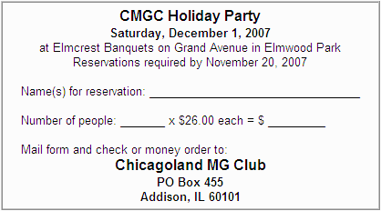 It is that time of year again! Or it will be before you know it! The club's Holiday Party Guru, Dave Ransom has lined up that well liked venue again for our yearly Holiday Party. The party will be held on Saturday December 1, 2007 from 6:30-12:30 at: Elmcrest Banquets by Biancalana's, 7370 W Grand Avenue, Elmwood Park IL 60707 708-453-3989.