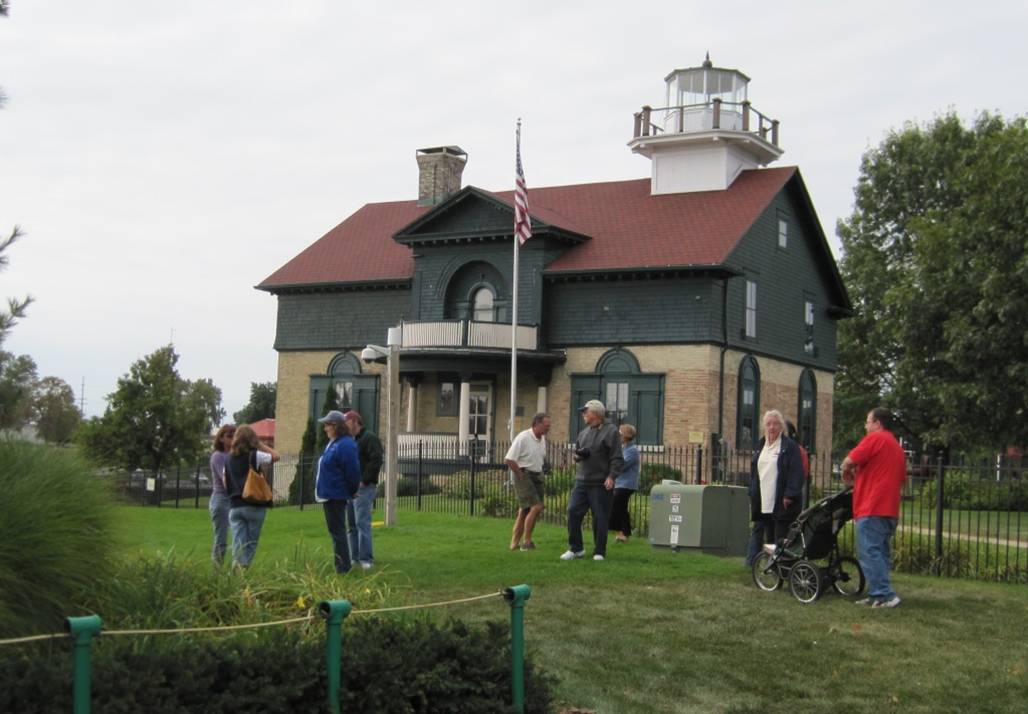 The weather this year was perfect. No rain during the tour at all. Saturday morning was cool and sunny as we headed north from our hotel. We passed through St. Joseph on our way to the first lighthouse at South Haven. We found it impossible for twenty-one cars to stay together. There were lots of towns with traffic lights and stop signs. The result was a missed turn leading to some of the groups getting north of South Haven. We finally arrived at South Haven Beach where we posed for a group photo. We had time to walk out to the light and enjoy the sunshine and increasing warmth.