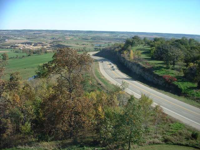 Interestingly enough, on our way east along Rt 20, after being passed by Reinout, we came up on a couple Miatas motoring along with tops down and realized that the one in back was Pat Marcis of the Windy City Miata Club. It turns out that they had their Fall Colour Tour on Sunday as well and were working their way back from Monroe, Wisconsin. We stopped along with them to fill up at a gas station near Rockford and found that they had had a turnout of 48 Miatas. One of their number was in the process of making their peace with a clutch on this trip in a lovely metallic blue Miata they had just gotten in North Carolina. We parted company with them shortly afterwards when they turned south on I39 to hit a truck stop at Rt 38 so they could re-stock on BugStuff which apparently is some miraculous solution for removing bugs from your car.