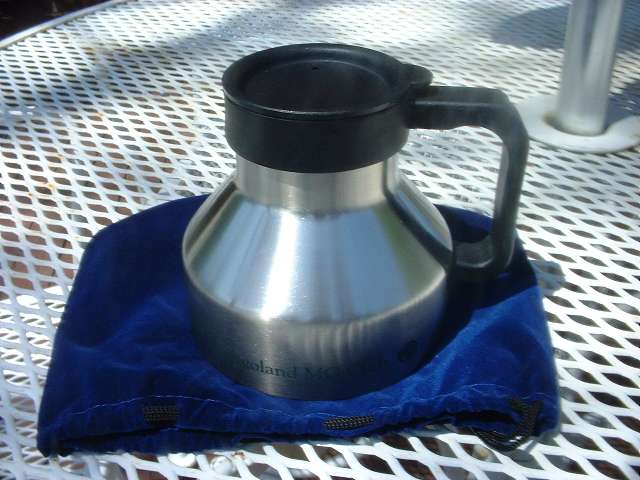 NEW - WIDE-BOTTOM (as in hard to tip over - sit on the floor) Stainless Steel Coffee Mug with Club Name and Octagon in BRG in velvet bag no less!