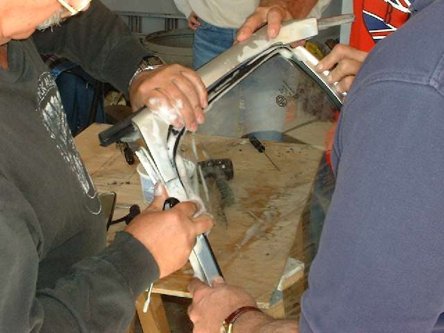 Several CMGC members gathered to rebuild the windshield on Mike Shuck’s 1973 MGB All went well with only moderate struggle, about as expected. By mid afternoon the new glass had been installed in the frame, and the entire assembly was installed on the car.