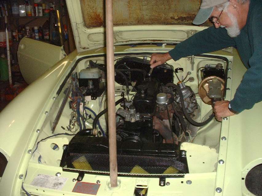 October 20, cool and breezy in the morning, we moved the car into the workshop for easy access to air and electric and all the handy tools. Temperature quickly jumped into the low 70's, light breeze and T-shirt weather. Nine people worked diligently for at least 5 hours (not counting lunch break), and a few people kept on to 5 pm, so we got lots done. Front and rear bumpers, manifolds, carburetors, catalytic converter, exhaust hookup, bonnet rear seal, wiper spindle trim, new fender bolts, finish of gearbox mount, and speedometer cable were installed.