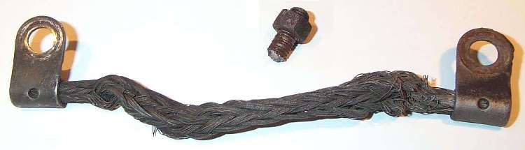 The following morning the car barely cranked at all. After repeated attempts to start the car, a wisp of smoke was seen escaping from under the bonnet at the rear of the engine bay. Oops! Key off and fire extinguisher ready before opening the bonnet! All appeared well- whatever had been smoking was smoking no longer. The battery charger was put into use again, this time to start the car. But something was very strange- the throttle pedal would not move. So we have finally reached the conclusion of this shaggy dog story. Later that day, the ground strap was replaced with a heavy-duty version from the local NAPA store, and the car has run perfectly ever since. The reason for this ground strap is that the drive train is electrically isolated from the chassis by various rubber mounts. Without a functional ground strap, another path to ground will be established, and this usually involves the brake lines, the fuel line, or (you guessed it) the throttle cable. This bad ground had been the source of all of our problems except the fan belt. The headlamps have their own ground, and thus, when the battery had not been drained, functioned perfectly even when the starter would not crank.