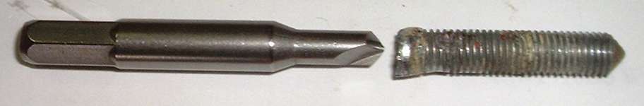 Some of the screws were being stubborn, so Cowboy brought out his screw extractors. Not to be confused with the ill-fated Easy-Out, these Screw-Out(TM) tools are actually special left handed drill bits formed much like a center drill. The stubby straight cutting flutes take a good bite and transfer some significant torque to the screw rather than making a low friction cut like a normal drill bit. This tool will quite often unscrew the fastener, so no fuss was required to drill out or repair the tapping plate in the door jamb. The Screw-Out tools are available as a set of three sizes from Sears as item number 52154.