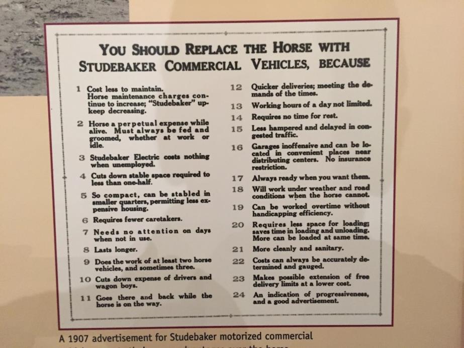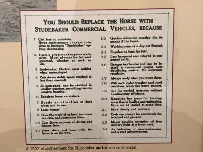 The battle was not only against gasoline powered vehicles but, also against the horse. In the 1907 advertisement Studebaker lists 24 reasons to replace your commercial horse down fleet with (their) electric vehicles. All 24 are great statements of the time, but I like 2 and 3 in particular. The horse has to be fed always, even if it is not working but ‘idling’, but an electric car costs nothing when ‘unemployed’.