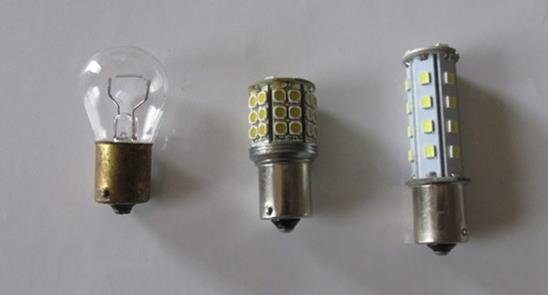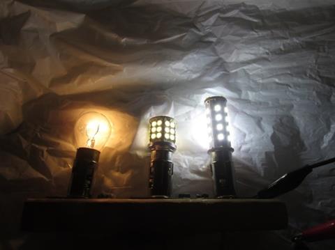 Photo 2: This photo shows some of the other bulbs which I have used in my MGB. The bulb on the far left is a standard 1157 dual filament incandescent bulb. It is used in the rear (red) Brake/run signal and the front (amber)Turn/run signals on my MGB. It consumes a maximum of about 23 watts with the brakes applied. The middle bulb is the first LED upgrade I made to replace the standard 1157 bulb. It consumes a maximum of about 4.8 watts with brakes applied. The bulb on the right is the latest LED upgrade to the brake/ run bulb. It is the brightest of the three and consumes a maximum of 6 watts with the brakes applied. I got this bulb from a motorcycle shop.