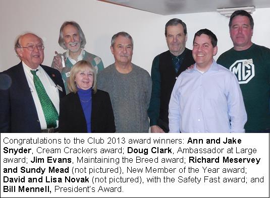 | Congratulations to the Club 2013 award winners: Ann and Jake Snyder, Cream Crackers award; Doug Clark, Ambassador at Large award; Jim Evans, Maintaining the Breed award; Richard Meservey and Sundy Mead (not pictured), New Member of the Year award; David and Lisa Novak (not pictured), with the Safety Fast award; and Bill Mennell, President’s Award.