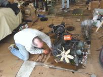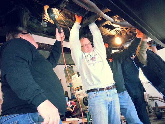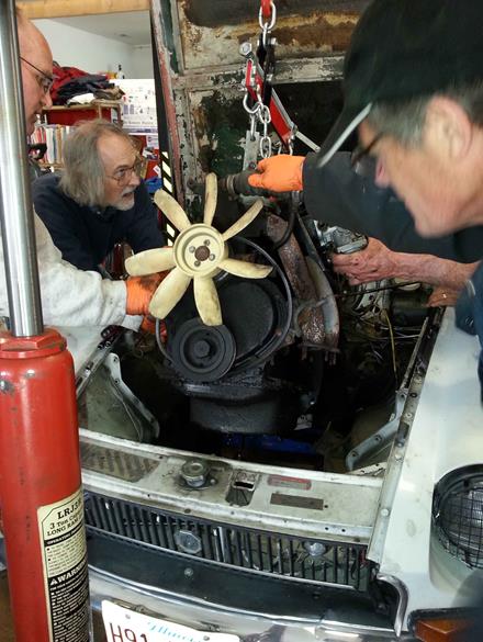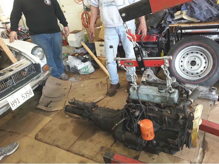 Most of the folks that were with Steve that day were not highly mechanical but under Steve's guidance they detached required cables and components and then worked with Steve to pull both the engine and transmission from this MGB. What a learning experience it was!! Once out they dropped the oil pan from the bottom of the engine, took off the oil pump and