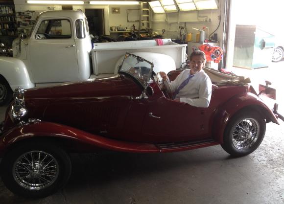 with his 6’3” frame sits comfortably(?) in his ‘barn find’ 1953 MGTD. See Cover Story inside.