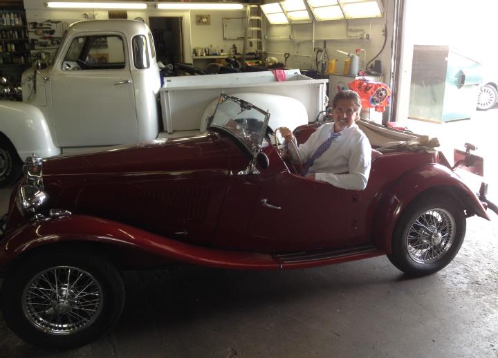 with his 6’3” frame sits comfortably(?) in his ‘barn find’ 1953 MGTD. See Cover Story inside.