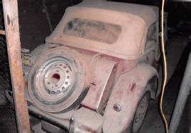 Jacqueline being a roadster had all her side curtains on. This kept the vast majority of the dust out of the interior. The narrow leather bench seat was and still is in great shape. Not a tear or a hole anywhere. All that was needed was some TLC to bring back the qualities of the leather. The original key was still in the ignition. Too bad it didn’t start right up. I know, I was pushing my luck. The body was in great shape and intact with only few nicks and dings from her first and only ten years of driving. The one sad part for Jacqueline was mice. Apparently, because Jacqueline lived in the country mice were prevalent. They ate through all the rubber hoses and cloth around the electrical wiring. There were remnants of nests in different areas under the hood. No wonder she wouldn’t start…