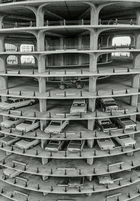The photo, in black-and-white, shows a MG, driving down in one of the Marina Towers in Chicago. There are several early sixties American cars backed into the parking places on the first five visible floors. The first open floor above that shows the MG nicely positioned between the pillars. Almost too nice of a shot to be a coincidence, isn’t it?