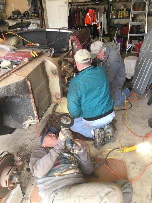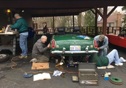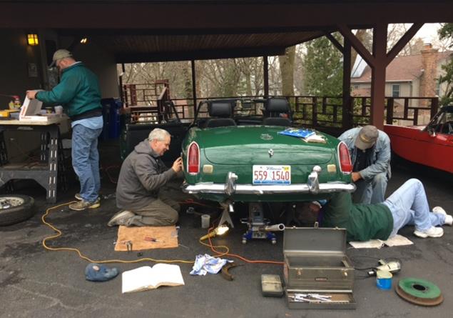 This is a shot of the "South of North Ave" crew working on replacing rear brake shoes and cylinders on my 1969 MGB., Sat. April 6. Work went well until a Moss Motors cylinder needed a little grinding to get in far enough for the retainer clip to be clipped on. Big thanks for the time effort and respected technical expertise to Dean Hikenlooper, Bill Kalafut, Steve "Sparky" Sparks, and Chuck McCallum.