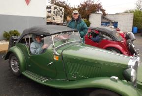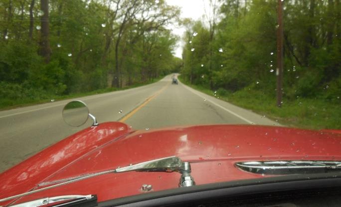 and ordered a coffee and a bagel. It wasn’t long before in comes Bob Lee also a bit early. He mentioned it looked like rain when he left Palatine this morning but it wasn’t raining yet. No sooner than he spoke, an incoming customer acknowledged that a red vintage car was outside getting wet in the drizzle that just started. Bob went out to but on his side-windows. At that moment, the remainder of the tour group arrived in the parking lot. Soon we were all buttoning up for the wet trip and headed on our way to Oshkosh.