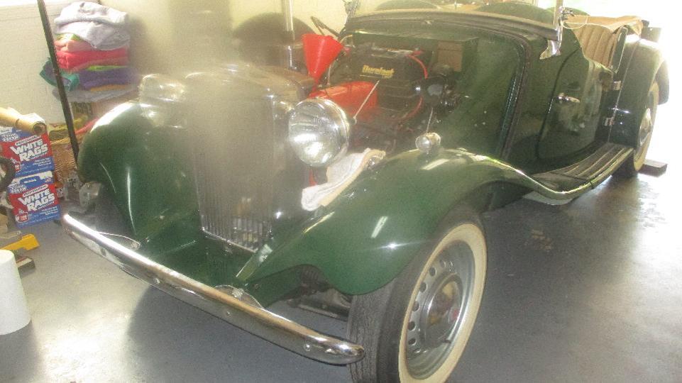 expressway speed, so we took an hour (or two) to pull some staples and retensioned it at the front, finished trimming and installed the Hidem strip and end caps. Very nice, and we hope it won't be coming apart again for at least another ten years. Then we poked around Less' 1953 MG TD for a bit in the evening, concerned that it would run (barely) but the engine was balky and could not be driven. Terry needed to install a new starter and change out stale fuel, so we came back next day to continue. After final setup adjustments on brand new carburetors, it was idling well but refused to run faster, cough, sputter, backfire. Long story short, we ordered some parts, came back a couple days later to R&R the timing chain to reset camshaft timing (which maybe wasn't necessary), and finally figured out it had a failed ignition condenser. Doh! Changed that out, and all is well that ends well, as it was finally running like a champ after years of puzzling problems.