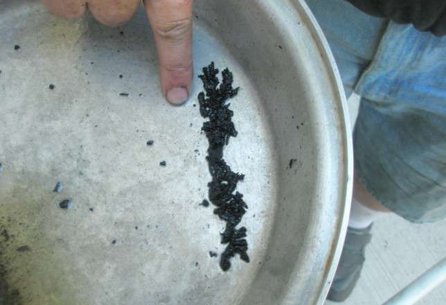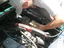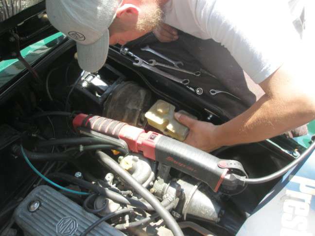 The completed unit was reinstalled into the car in short order. Bleeding the system was per-formed utilizing an EZ-Bleed unit. Three of the wheels were air-free in short order. The forth wheel was not cooperating—even with firm pressure on the brake petal, no fluid was being expelled through the open bleed valve. Troubleshooting the problem found a serious amount of rubber-like material being ejected from the opened brake hose. With the lines clear, the system bleed was completed. This brake line hose will have to be replaced at the next opportunity.