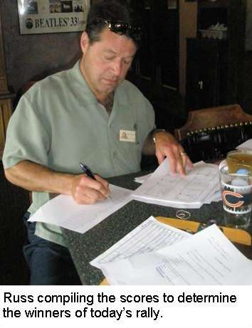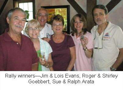 As far as the clues and questions that would determine the Rally winners by points, oh, Russ and Amy had tricks. These questions were hard. But somebody answered each question correctly, so they weren’t impossible. First place award went Jim and Lois Evans with only 16.5 out of 20. Second place was Roger and Shirley Goebbert with 12.5 points. Third with 11.5 points was Ralph and Sue Arata, who were last to finish (we were second last). And fourth was last year’s winners, Steve and Liz Gorr with 10.5.