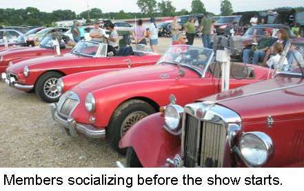 There were 13 cars forming two rows together near center stage for viewing. By coincidence, the green cars were on the right, red cars on the left (with a burgundy and a yellow Corvette in the mix).