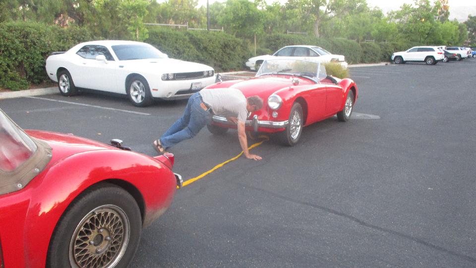 While returning from the BBQ one of the MGAs blew a core plug and showered the MGA following with antifreeze (for which I had a spectacular view from the third space back). I then got to tow the failed car about four miles back to the hotel, followed by a quick installation of a new core plug while half a dozen people enjoyed the impromptu tech session. All in all, a rather typical gathering of a couple hundred MGs.