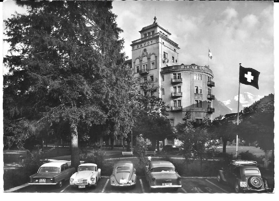 A postcard from Interlaken. In front of the Savoy Hotel is a MGA Coupe with Swiss license plate AG 45907.
