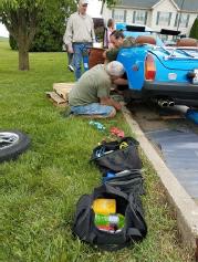 On Saturday morning some unscheduled work had to be done. Jamie and Tim Schafer’s blue MG Midget needed an emergency break line replacement. Some inventive club members made the repair using the parking lot curb and a few scavenged wooden pallets as a makeshift car lift! Well done! Then, while lining up for the first leg of the drive, Penny and Victor L’Heureux’s engine was slow to start. Luckily, that was quickly resolved and with only a slight delay, the drive was on!