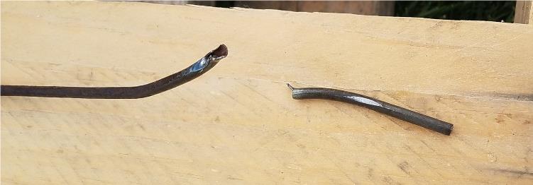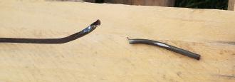 Hand brake cable sawed through the brake line.
