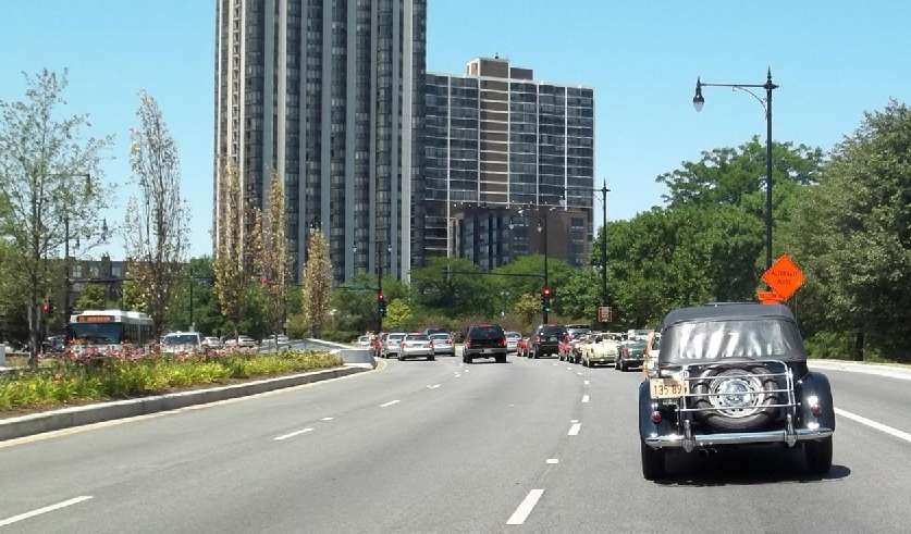 The Sheridan Road drive, past the Botanical Gardens, Ravinia, and many a North Shore mansion, is one of the most beautiful in the country, perfect for this kind of car. In fact, we saw many fellow vintage car drivers going by, especially the Rolls Royces who were having a show along the way. We stopped briefly for a meet and photo op at historical Fort Sheridan, which many of us vowed to return to tour. Then there was Evanston (and a stop for an ice cream at Evanston beach on this picture–perfect day) and Rogers Park, with the normal traffic lights and city driving, which only whetted our appetite for another of the most renowned drives in all the land: Lake Shore Drive. With the lake on one side and high rises on the other, the entourage cruised beautifully south in light traffic to exit at LaSalle, which everyone knows is North Avenue, for the short drive west to the Goose Island pub.
