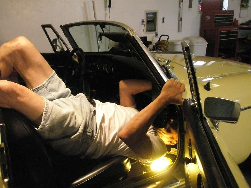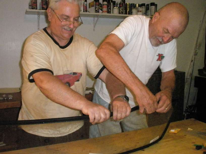 We had four club members - Don Haag, Victor L'Heureux, Barney Gaylord, and Thomas E Lancaster Sr. - and a couple extra hands from Don’s son to replace a damaged windscreen on Don’s MGB. Removing the windscreen wasn't too bad a job. Fifteen minutes for the first three bolts, and 45 minutes for the fourth one tucked in behind the dash high on the right. It also helps to remove the glove box liner box to have access through that dash opening for working the two bolts on the right side. Two more bolts from bottom of the center stay, and it's lift off time.