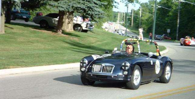 The weather, as always, was warm and fine. Rain seldom falls on the track on this weekend. Many of the classic cars were there, including the McClaren MP6 series cars, several in McClaren orange paint. They seem to get faster every year. Absent were the Allards and Kurtis cars built in the 50s. And absent also was the metallic blue Scarab ‘Meisterbrauser’ of Augie Pabst, Jr., though he is still listed as a director of Road America. Although none of the usual Chicagoland MG Club racers were participating, we knew others who were on the track, including Randy Byboth, from the Minnesota MG Club, driving his gorgeous blue