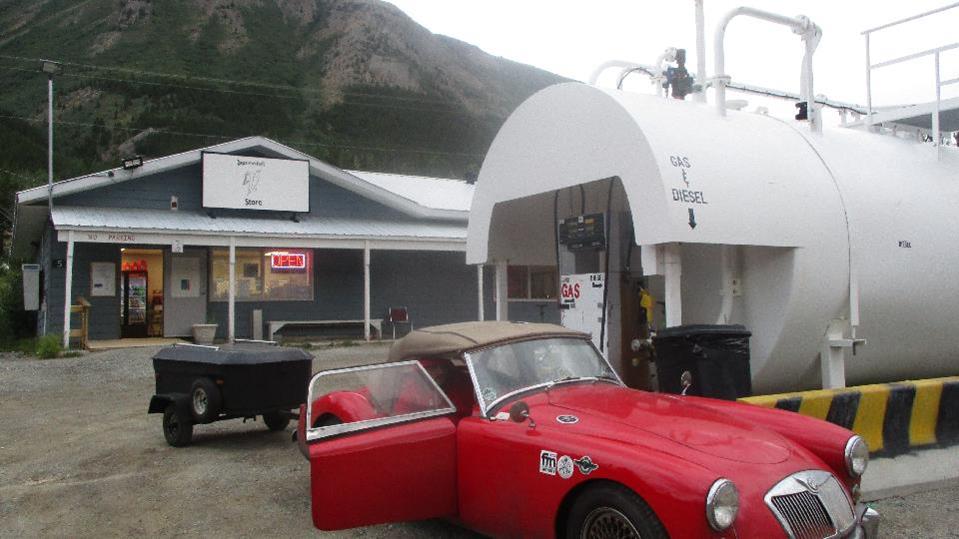 weather and higher altitude, landing in Prince George, 430 miles by day's end. On the 29th Yellowhead Highway 300 miles where some or the hills are 7-8% grades in 3rd gear with the trailer, wonderful scenery, not much traffic. Then BC-37/Stewart-Cassiar Highway 97 miles, Cassiar Hwy/BC-37 352 miles just into Yukon Territory and a few miles up YT-1/Alaska Highway by 1-am, 760 miles for the day. On the 30th we found the Alaska Highway in western Yukon Territory to be somewhat deteriorated and rather hard on the car. We had to stop for an hour to reattach the LF shock absorber to the frame, and shortly thereafter two hours to replace a blown head gasket (which had lasted only to months). But carry on, and by day's end we had