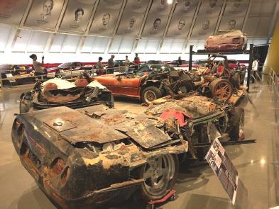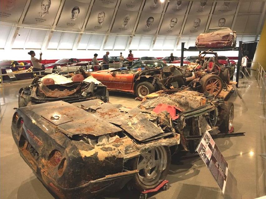 In 2014, eight Corvettes fell 30 feet down into a sinkhole that developed under the museum floor. It is hard to comprehend the massive forces at play when the museum floor collapsed. Unlike sheet metal which can be bent, dented, and torn, some of the fiberglass body panels of the Corvette are just no longer there, ground back to dust and disappeared completely, leaving five of the cars unrepairable. The other three sustained much less damage and are back in their pre-disaster condition.
