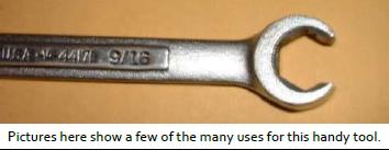 For nearly any car, you need these things. This is not "special", but many people still ask, "What's a flare nut wrench?" As in the picture below, it looks like a box end wrench, except with a small section of the end removed so it can be slipped over a hose or tube for use on those pesky tubing end fittings called flare nuts. The flare nut wrench will always be six-sided (with one side missing) and thick wall for rigidity. In use it will catch 5 corners of a 6 corner nut and allow high torque without ripping the corners off of the nut or collapsing a thin wall nut like a two-sided open end wrench would do. This is especially important for tubing flare nuts which are thin wall and subject to being easily smashed, and for brake line fittings which are small and easy to round off the corners.