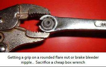 For that (hopefully rare) occasion when you truly butcher a hex nut fitting and round off all the corners beyond any hope of getting a grip with any normal wrench, even a flare nut wrench, here is a solution that could save your britches. You will have to sacrifice a good wrench (make it a cheap one), but it may be the only way out of a jam. Starting with a 12-point thin wall box end wrench, cut a narrow notch out of the end to break the ring. This will destroy the normal function of a box end wrench, because it will lose a lot of rigidity with the ring cut open. Slip this seemingly worthless tool over the damaged hex fitting, then clamp a small locking plier onto the ring of the tool to constrict the metal onto the damaged fitting for a good grip. This way you can get a really tight grip on a hex fitting without smashing it, even when there are no visible corners left on the fitting.