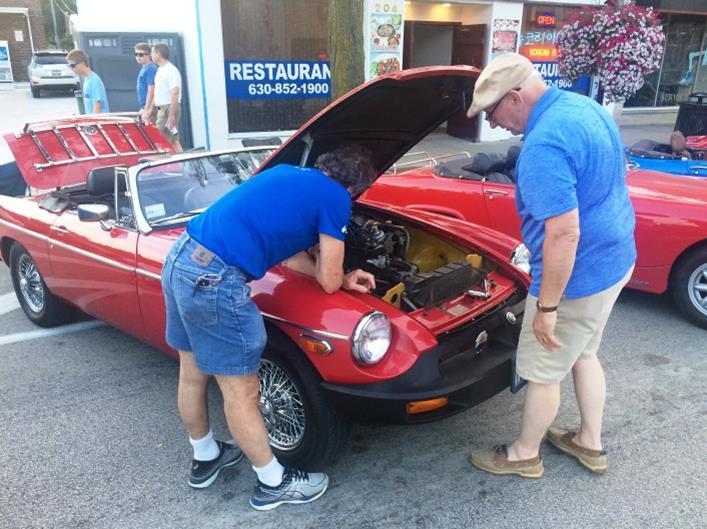 Bill Kalafut’s 4th annual Westmont Cruise Night was once again a big hit. There were 20 members and two perspective members showing up in various vintage MGs. Bill counted ten MGBs, two MGB GTs, two MGAs, two TDs, two Midgets, one MGB with a V8, and rounding out the list was Dino’s famous RV8.