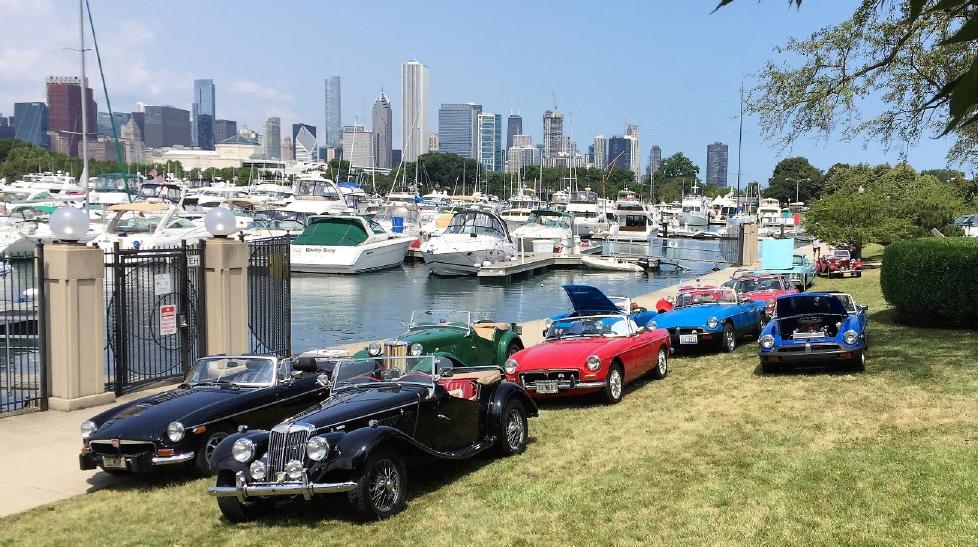 Sheridan Avenue winds it’s way from the Wisconsin border well into Chicago. We drove the portion from Winnetka to the beginning of Lake Shore Drive, then drove alongside the lake to the museum campus. The Burnham Harbor Yacht Club is located right next to where Meigs Field used to be. It has been in the same location for decades. The same cannot be said about Meigs Field. Thirteen MGs, the wannabe and a 1965 Lincoln Continental lined up on the grass next to the water while the drivers and passengers ate lunch looking across the water to where a flying saucer had landed on top of what was Soldier’s Field. The baby blue Lincoln was amazing. All original, it was three times the size of any of the MGs. It was also three times as heavy. Tim and Jamie’s MG Midget could have fallen asleep on the back seat, and any of the other MGs would have fit comfortably in its trunk. We all had a good look and left it there.