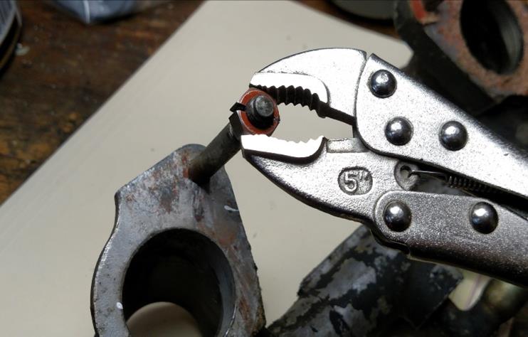 So….what to do? Yes, you could go buy a stud remover/installer. I know. But that’s too easy. And I’d be concerned about thread damage when removing really tight or corroded studs. So, what this camper did is take an appropriately sized nut and….come on, all together now…. cut it in half! That’s right! Now I can nestle the two halves onto the threads of the stud and clamp them tightly with a vise- grip and ...voila!...I can turn the tightest stud with ease. It makes an incredibly tight grip and does absolutely no damage to the threads. In fact, I’ve used the same method to actually restore damaged threads. Just loosen up on the vise-grip pressure a bit and turn the half-nut set around the threads of a bolt or stud a few times to restore the damaged area.