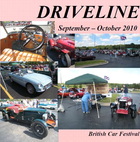 August 2010 July 2010 June 2010 May 2010 April 2010 March 2010 February 2010 January 2010 December 2009 November 2009 October 2009 | |  Driveline - September-October 2010 Cover - British Car Festival pictures Intro & Club Officers Editor's Corner Left Hand Drive Right Hand Drive Welcome New Members Meeting Minutes, September Auto Appraisal Group (ad) Library Muse Top Gear 10 Top Gear 11 Inside the Ocagon 2 Directions (Driving Events) Directions (cont'd) Vintage Sports Car, LLC (ad) Lucas Night Rally, the newbie's Lucas Night Rally, the rallymaster Lucas Night Rally, General Instructions Fransen & Son, Foreign Car Specialist (ad) Orphan Auto Picnic Wine, Cheese, and Beer Tour British Car Festival, Steve Selan British Car Festival, John Kerns Steve's British Connection (ad) |  Celebration of MG Car Club's 80th Anniversary Regalia and the Holidays 2nd Annual Halloween Run Club Officer Nominations Fall Color Tour "The Leaf Peepers" Fall Tune Down Party Cruise to the Rock Tech Time, the Tach Now Works MG Fixers, the Latest Version Classified Advertisements Photos - Tach Repair Photos - Wine Cheese and Beer Tour CMGC Event Calendar Back Cover British Car Festival pictures | | | Index    ©2010 Chicagoland MG Club, All rights reserved. |