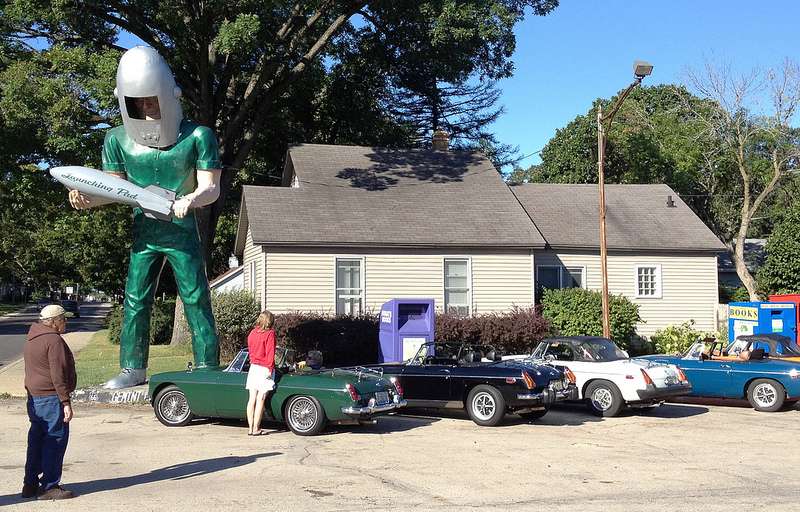 where the group made its first stop next to the Rocket Man statue at the Launching Pad restaurant, allowing participants who had been separated by traffic to reconnect. We had 20 cars on the Tour (M-type, MG-TD, 2-MGAs, 12-MGBs, MGC, TR6, and 2-modern cars). The group continued through Braidwood, Gardner and Dwight before stopping at a restored Standard Oil station/gift shop in O’Dell. Along the way enjoying the vintage roadside Burma Shave signs.