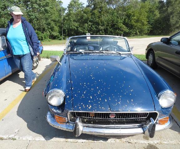 and the day turned pretty decent. We did pass over some recently wetted farm roads and a good deal of mud was kicked up by the tires and all over the cars (at least I hope that was mud — we were in cow country) which lead to some interesting looking cars by the first group rest stop (I can’t remember ever seeing mud caked on the sills like this on any of these cars. And Bill and Deb Mennell’s MGB had an impressive collection of mud spatters on the bonnet – apparently from following Drake Van Beek’s non-MG very closely).
