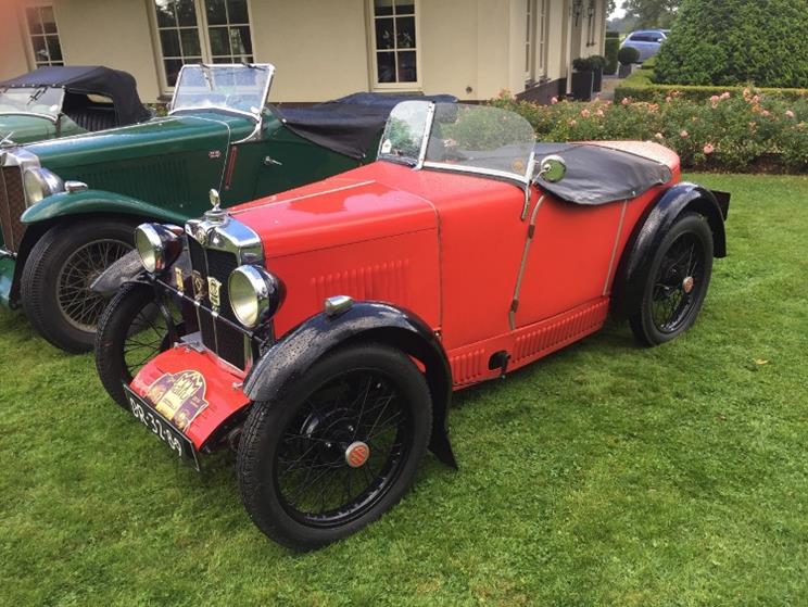 go uphill (up-overpass or up-bridge) with ease in third gear. Soon after the start the rain returned, but we kept the top down and while hiding ourselves behind the aero screens, we could stay dry. But then it started to rain hard and we had to put the top back on and the real wind shield back up. And boy, is it nice to have two windshield wipers instead of just one. Specially in the Netherlands where it rains more often than it does in Chicago. After a while, when a hint of the sun appeared behind the thinning cloud cover, we stopped once more to take the top down again to fully enjoy the ride. There were no break downs and all (about 20) pre-war MGs made it back to the finish in running order.