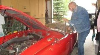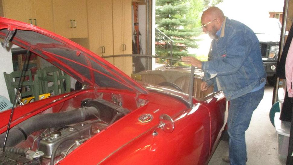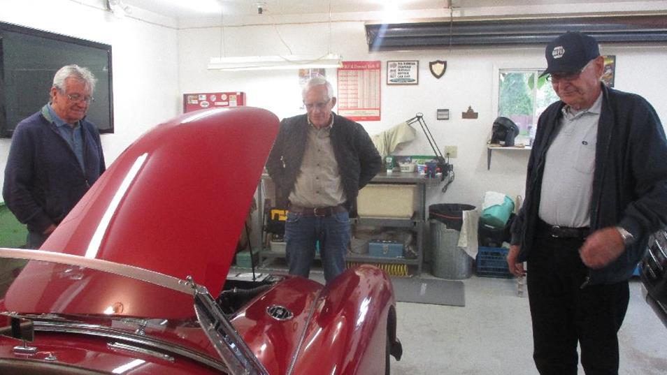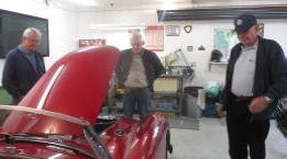 hours are irregular. Later evening we connected with Duncan MacFarlane in Calgary, BC. His MGA 1600 was running a little rough, and rattling rather loudly. Valve lash was between 1 to 1-1/2 turns for each valve, 4 to 6 times the specification, or in the range of 0.060-0.090-inch clearance (wow)! We wound them all down to 0.015, put oil in the dashpot dampers and adjusted the carbs, and it runs like a top. A small rumble at front of engine traced to slightly loose bearings in the water pump, so put one of those on order.