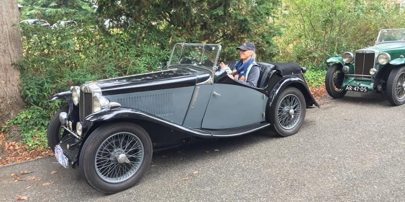 The 1934 NA two-seater is a 6-cylinder Magnette. Dick installed a pre-selector gearbox and modified it so that it can be operated by hand instead of its normal left-foot gear-change pedal. (which is not the same as a clutch on a regular transmission) Now, Jacqueline can change gears without the strain of double-clutching on her painful knees. Jacqueline considered buying this Magnette a long time ago. However, the drivability of more modern MG won at the time and an A became her first MG. When the Magnette showed up many years later she couldn’t resist and bought it after all.