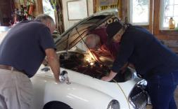 We spent much of the day working on Bob's MGA Coupe that ran so bad it was hardly drivable. We had to rearrange the fast-idle linkage, shorten the choke cable, invert shaft clamps and balance air flow, re-orient the distributor base clamp to set timing, re-route the vacuum advance pipe. Closing in on final tuning we found the distributor only giving 7-degrees of mechanical advance (3-1/2-d in the distributor). Giving it proper timing at road speed left it too far advanced at idle speed, which also